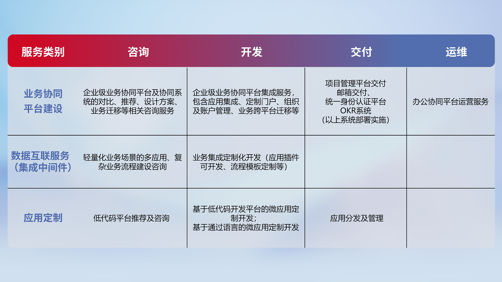 针对钉钉、、、、企微、、IDaas等平台级产品提供产品的规划、、、、方案、、、、交付、、、、定制化开发等服务,,,,实现如统一协同办公、、智能客户服务、、、、混合会议管理、、、、智能数据查询、、、、等业务场景,,,,实现数字化转型。。。。
