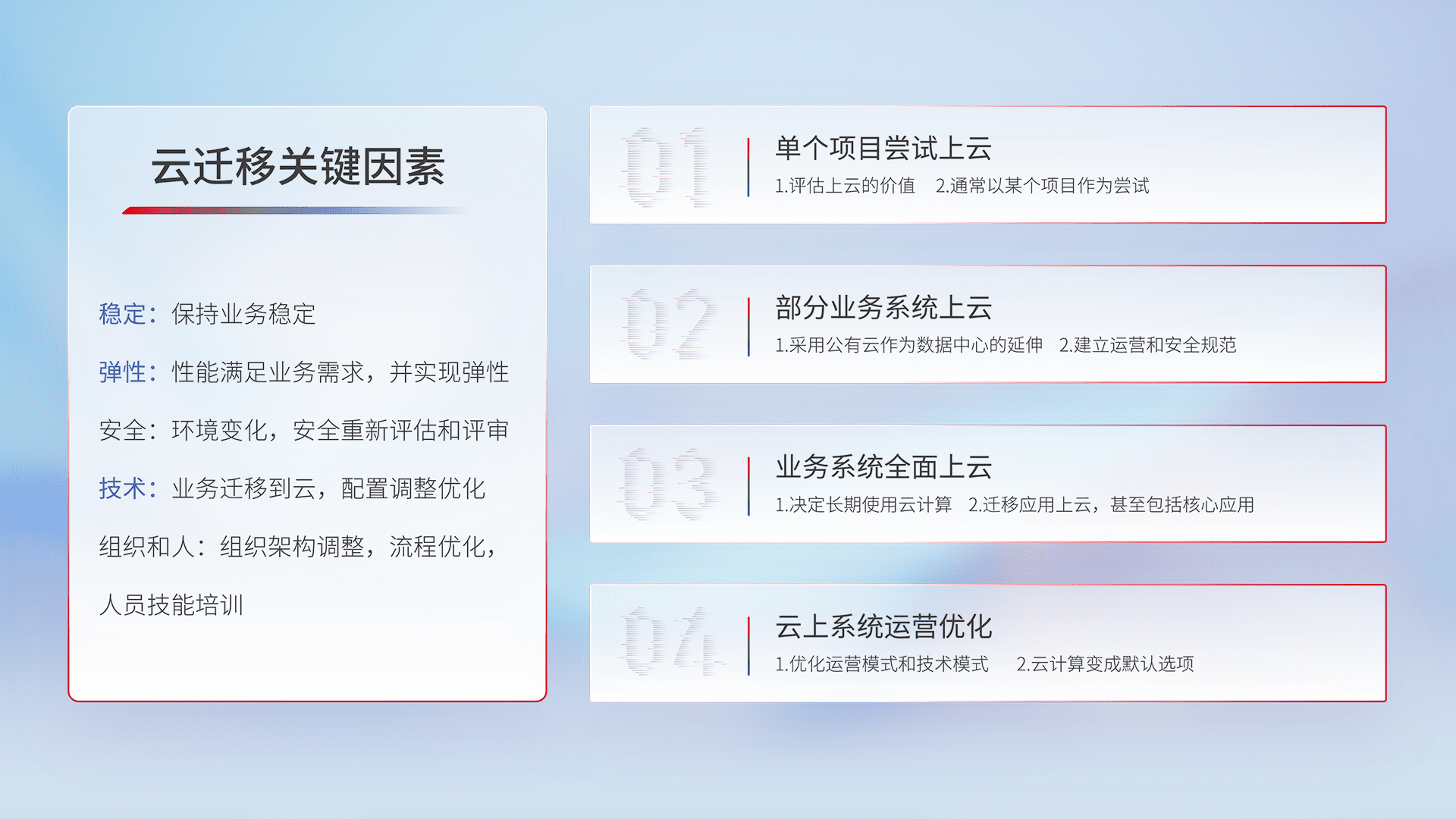 结合实际业务,,,,从规划设计、、、、云平台选型、、云原生改造、、、数据迁移、、集成交付,,,,迁移全过程为客户识别最佳上云路径,,,做好风险识别管理,,,,设计网络架构、、、、身份权限、、、安全审计合规、、操作审计、、日志审计、、监控告警策略、、、多站点容灾设计等,,,,对云上基础设施进行整体规划,,,,提升IT治理水平,,,以满足弹性、、高可用、、高性能的需求。。。。