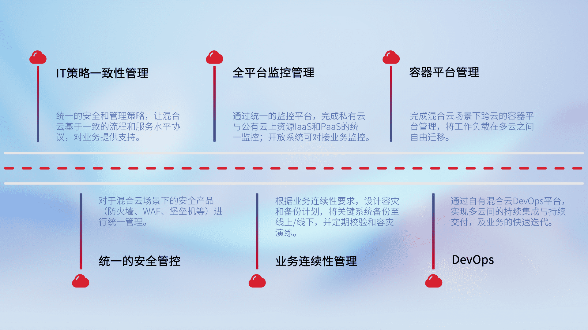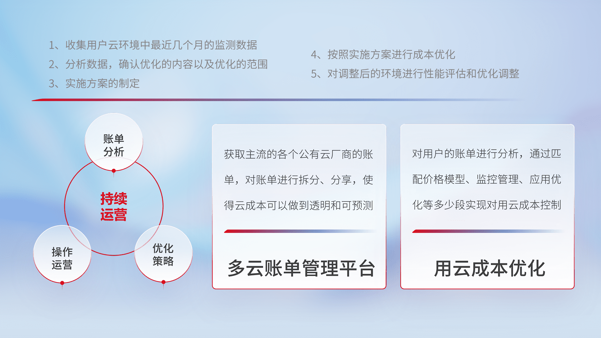 通过多云纳管,,,,以统一的资源数据模型把客户的云资源进行抽象和封装,,,,进而实现对多云资源的统一操作,,,保障云资源管理的可靠性、、稳定性与可用性。。量身定制化运维内容,,配置、、开发运维、、补丁管理、、备份、、、、监控、、、、认证和访问管理、、、审计和日常巡检等,,,,保障在用云过程中的可靠度,,,,稳定度以及高可用率。。。。